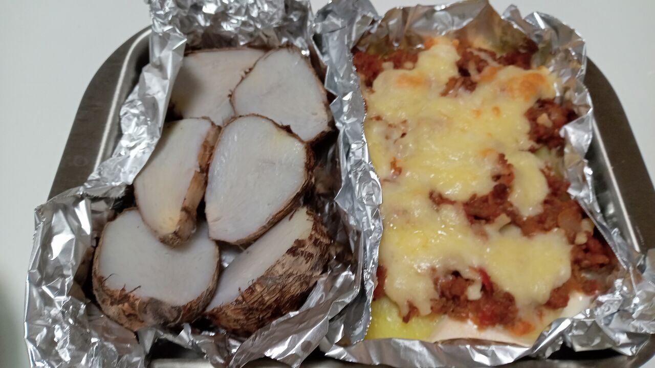 右はじゃがいもをチンして生クリームをかけた上に鶏ミンチで作ったミートソースと