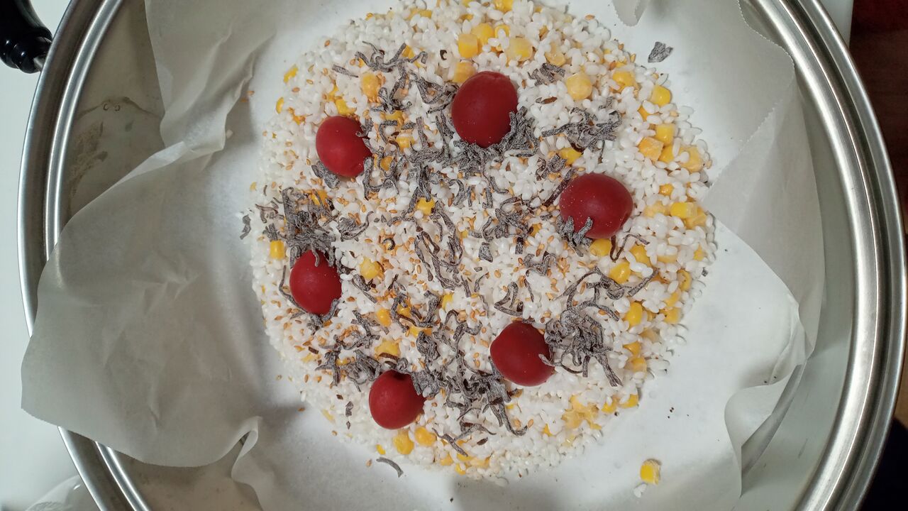 残り半分のもち米をのせて上に具をトッピングして見た目はいい感じ