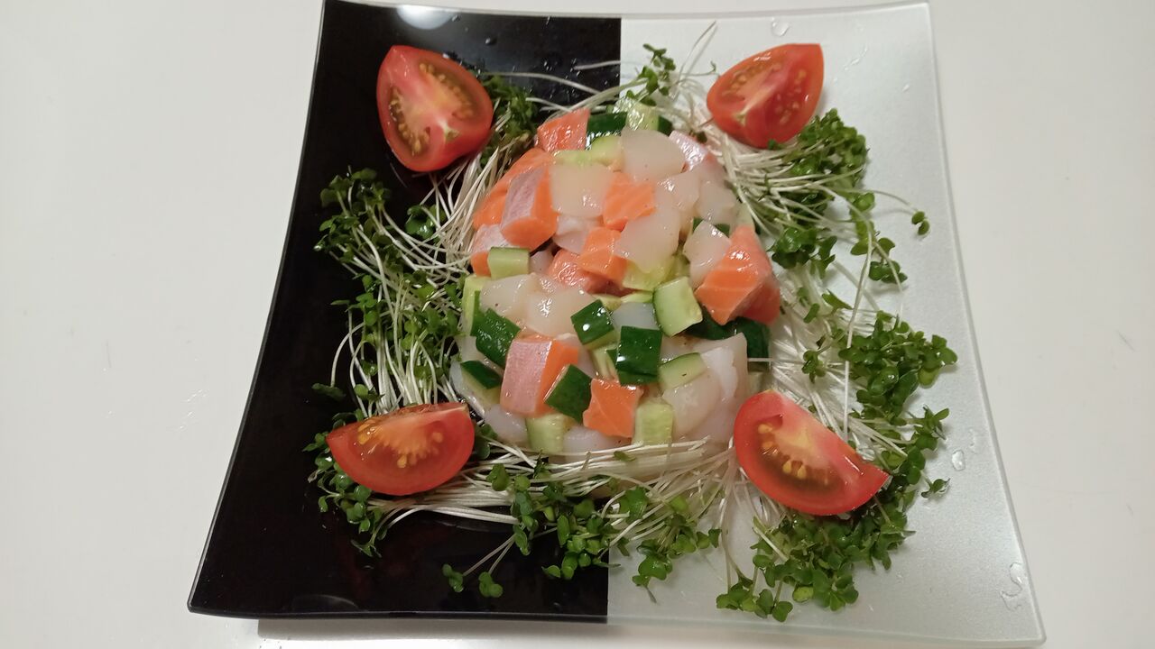 サーモンとホタテと胡瓜をサイコロ状に切り器に入れて形作り