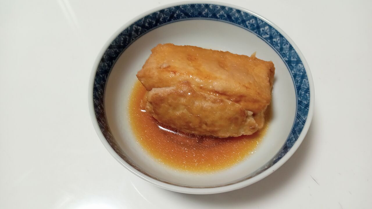 厚揚げに鶏ミンチをはさんで甘辛く煮ました