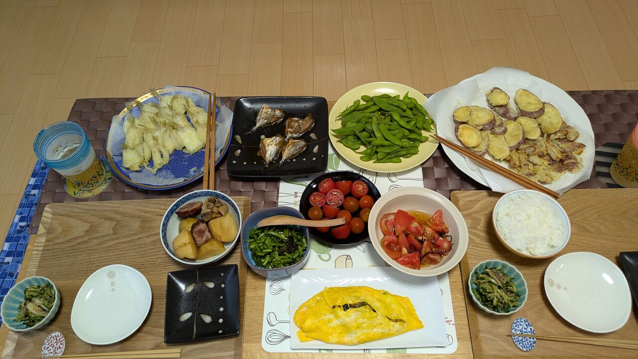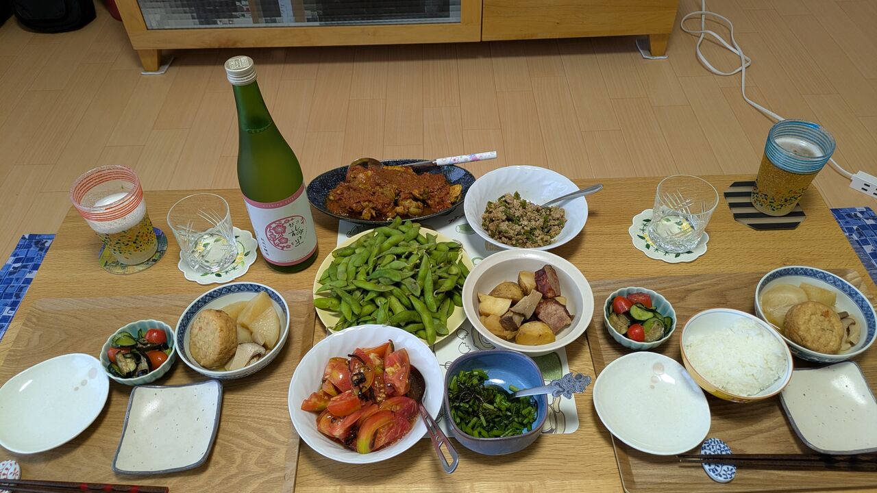 山形のだしのせ納豆、キムチチヂミ、上沼恵美子さんの揚げ玉豆腐、枝豆、トマトとともに