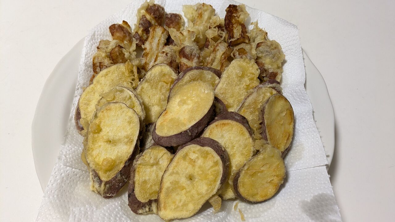 「ついでだから、これも揚げておいて」と横から差し出した(笑)さつまいもとちくわ