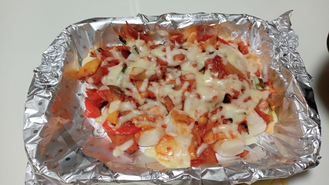 お正月の残りのお餅を小さく切って焼いてから、キムチ・ベーコン・パプリカ・キノコ