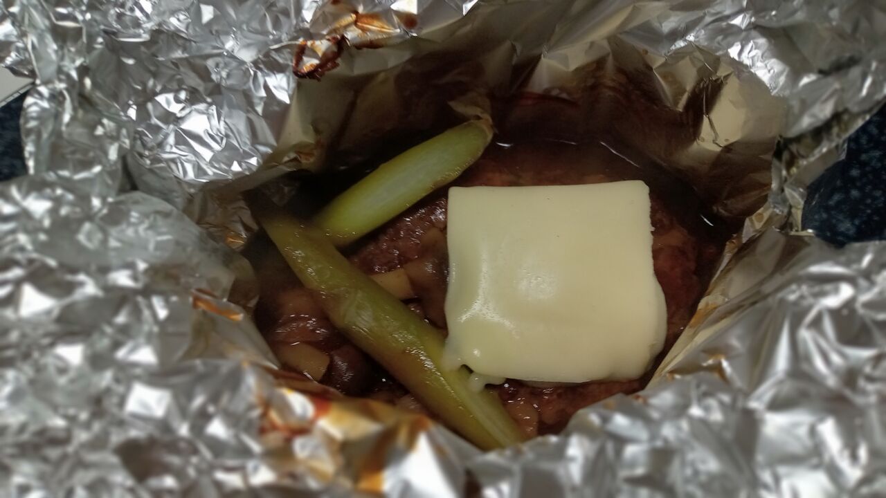 フライパンでハンバーグの両面に焦げ目をつけ、きのことアスパラとともにアルミホイルに