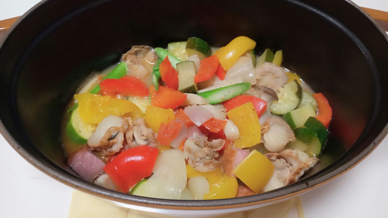 ベビーホタテ・ベーコン・パプリカ・ズッキーニ・エリンギ・玉ねぎ・トマト・アスパラを