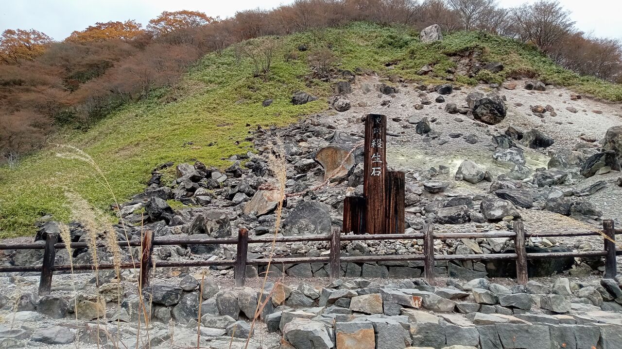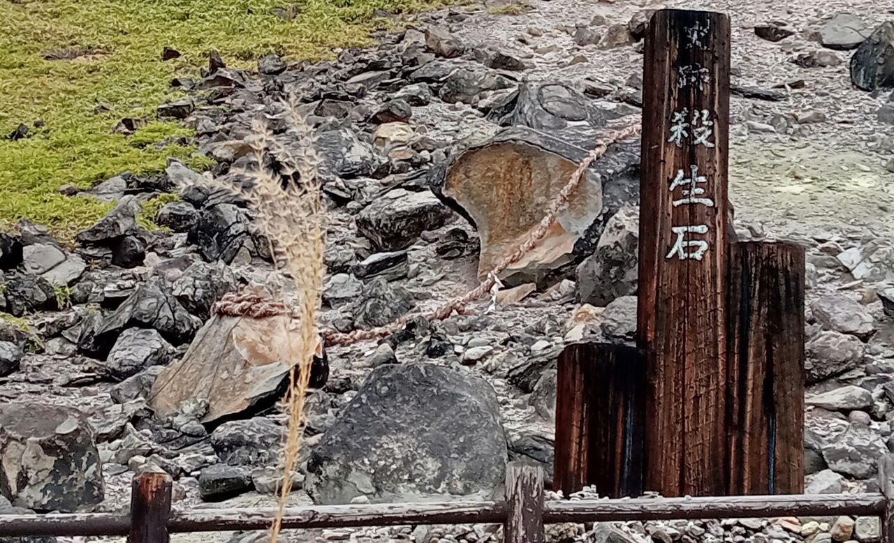 写真で見たことのある「殺生石(せっしょうせき)」ですが・・・昨年割れたそうです