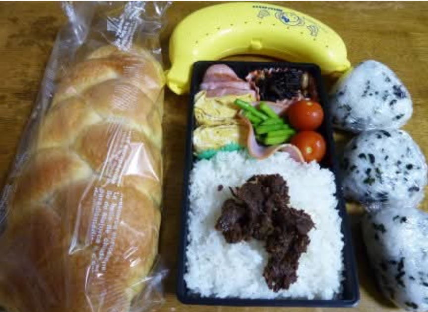 お弁当プラス パン、バナナ、おにぎり