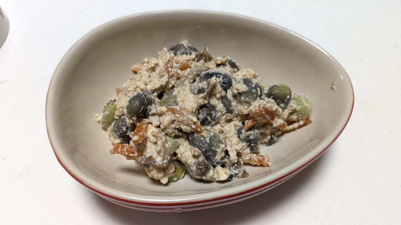 黒枝豆の白和えは練りごまも少し入れました