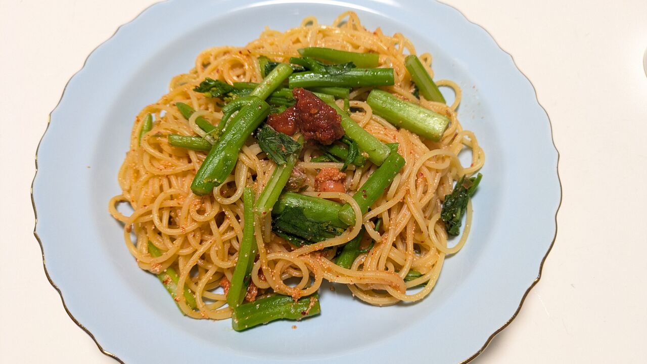 ある日の昼食は、まかない明太子の賞味期限が切れかけたので、明太子スパゲッティにしました