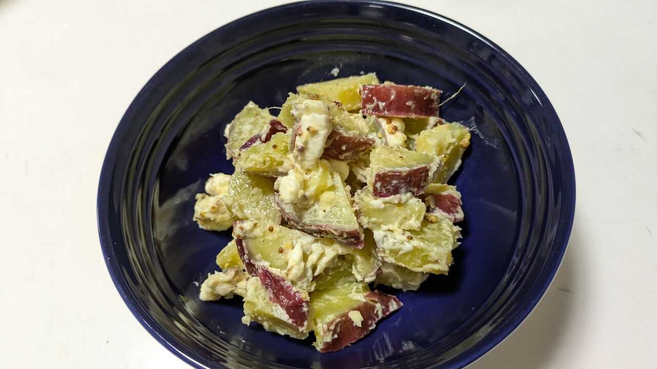 義父のさつまいもを茹でて、マヨネーズ・粒マスタード・クリームチーズ・塩コショウで