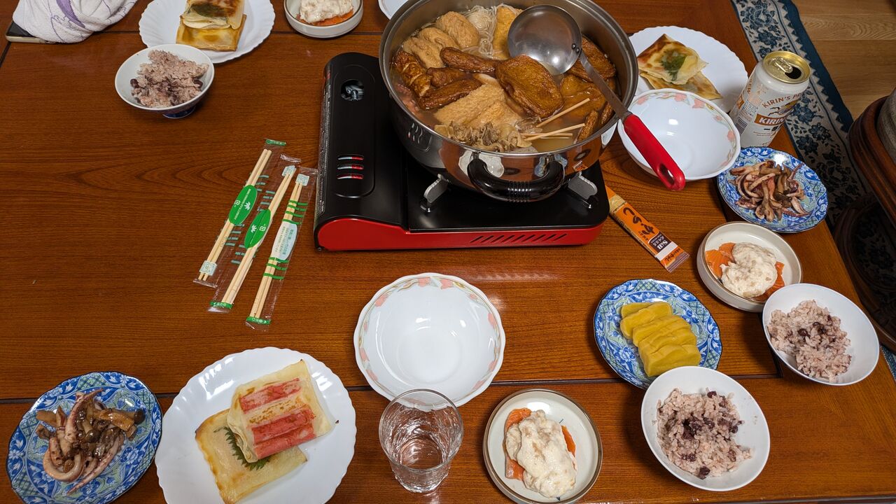 メニューはおでん、イカとキノコのガーリックバター醤油炒め、焼き春巻(大葉・チーズ・