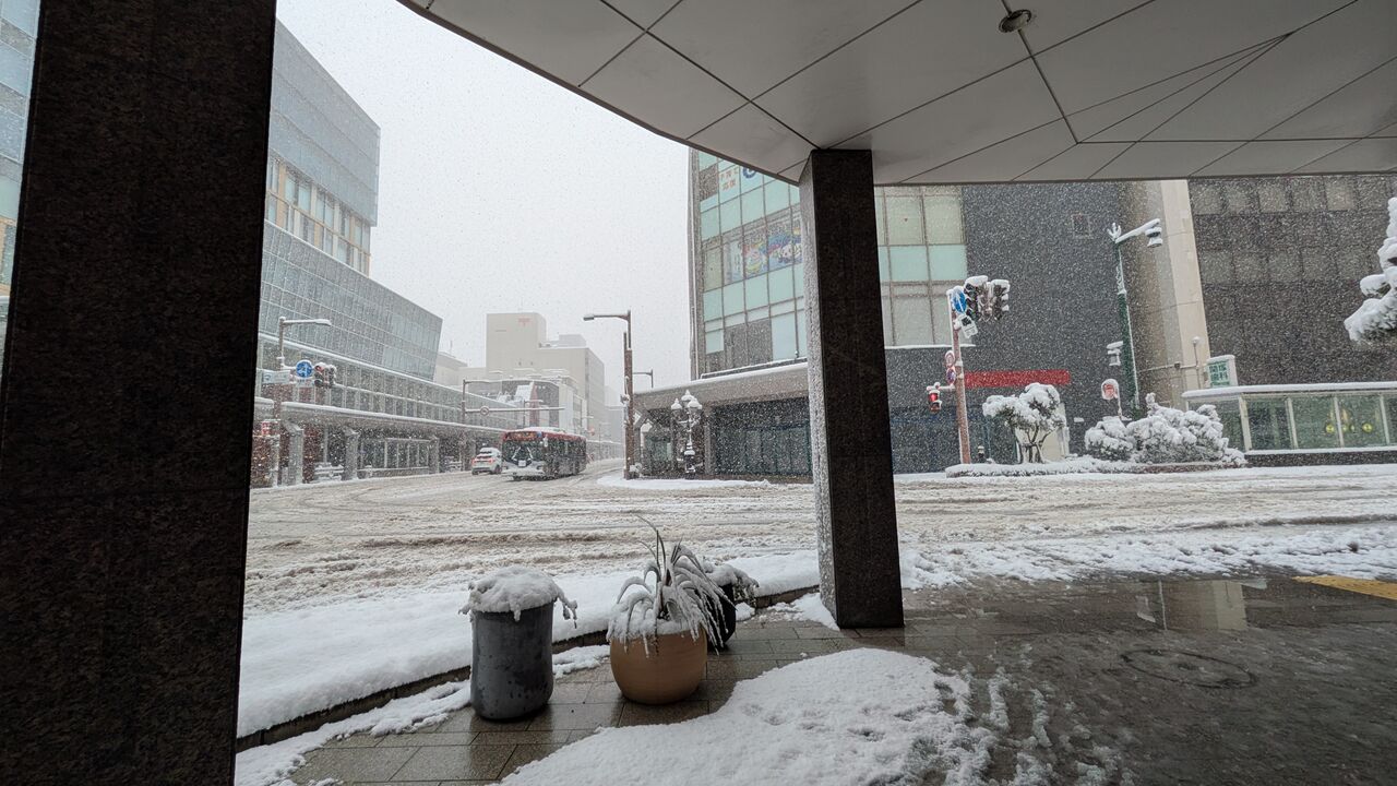 古町でバスを降りて新潟のメインの大通りですが車道が雪まみれでした