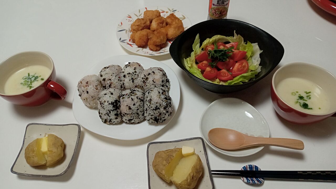 じゃがバター・鶏の唐揚げ・サラダ・おにぎり・