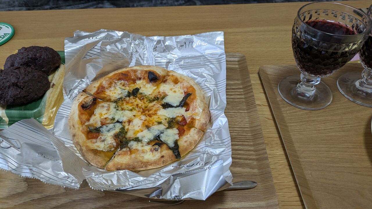 お昼は原信のピザとおはぎにワイン、そしておかきやポテトチップスまで食べたら