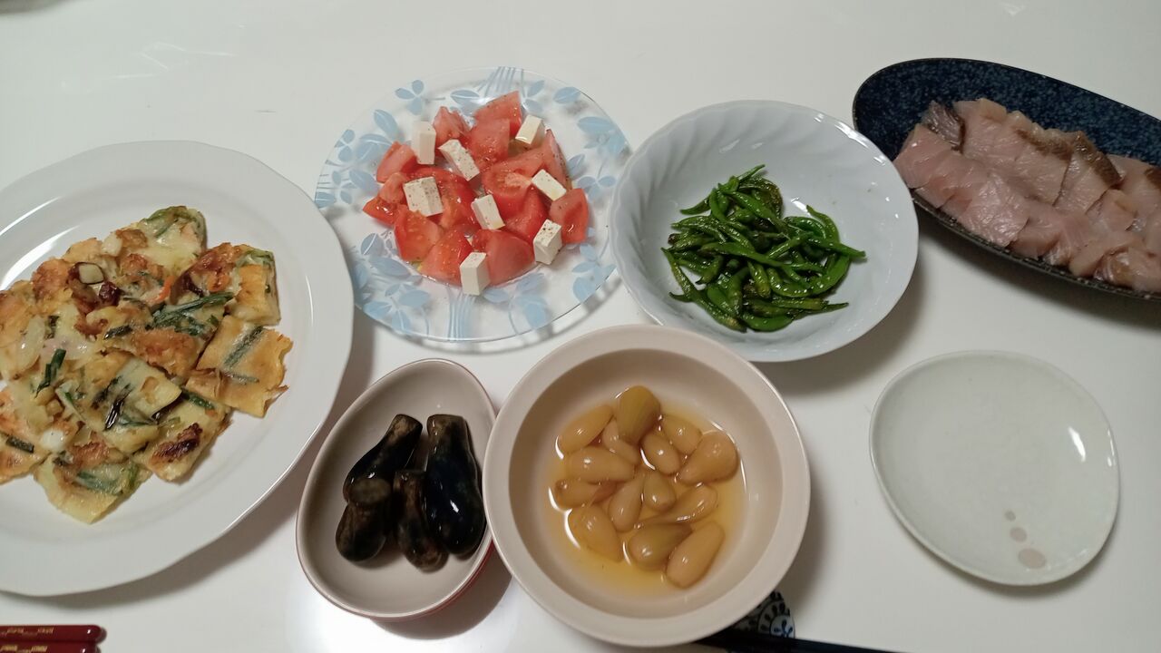 キムチ鍋、枝豆、新玉ねぎの酢漬けなど