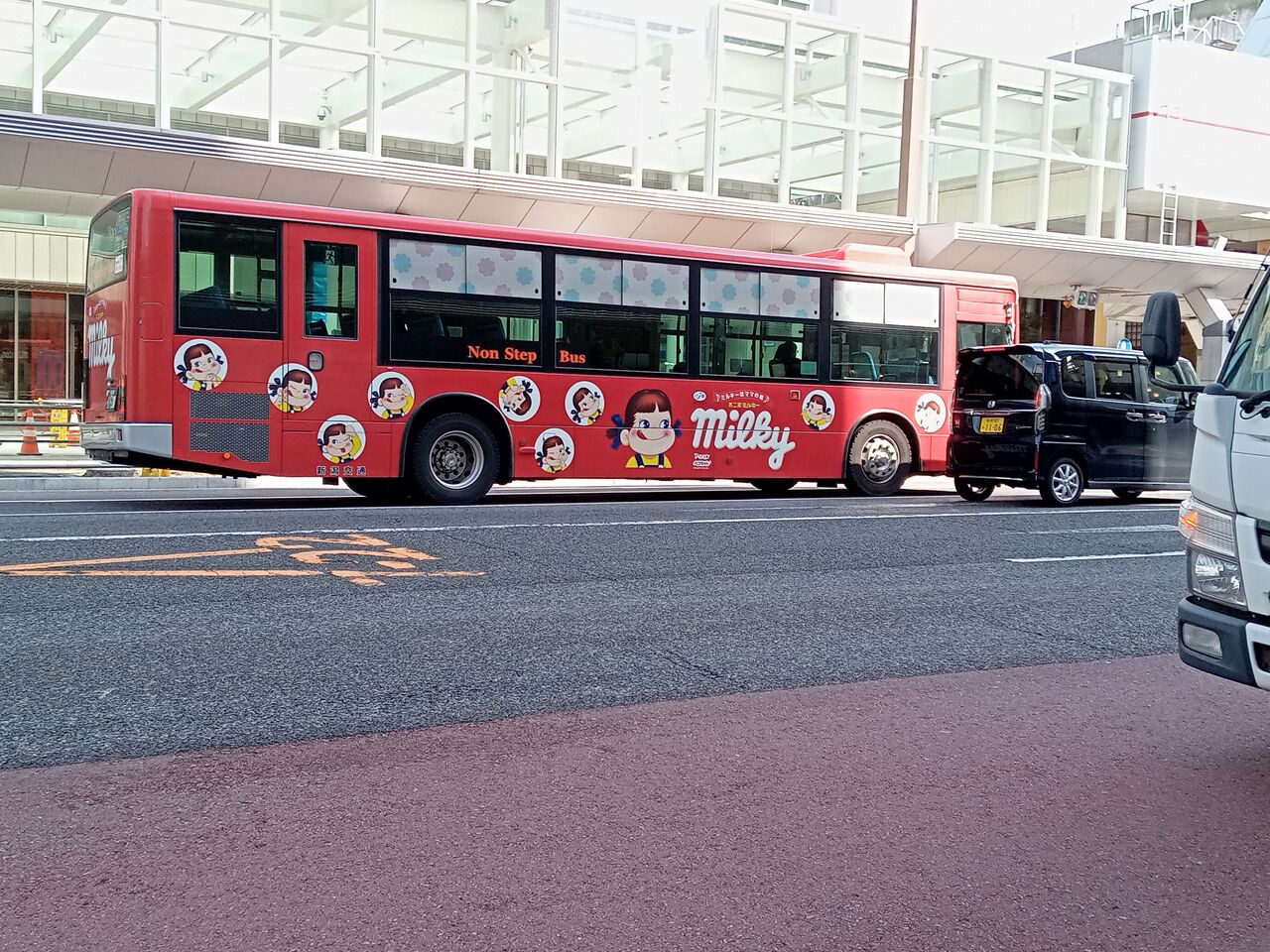気を取り直して歩いていたら、ペコちゃんのバスを発見!