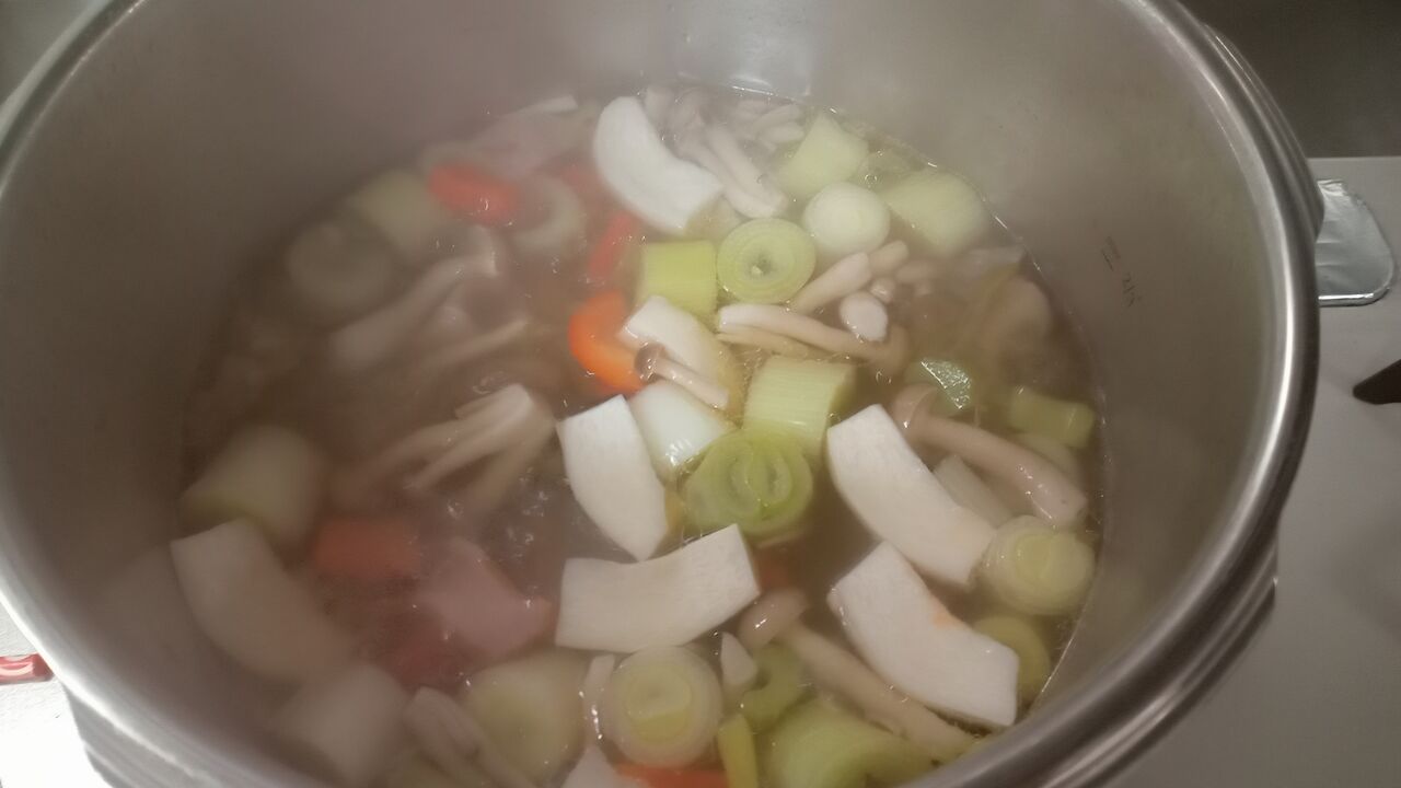 具を一旦取り出して、スープの中にベーコン・キノコ・パプリカ・長ネギを加えて