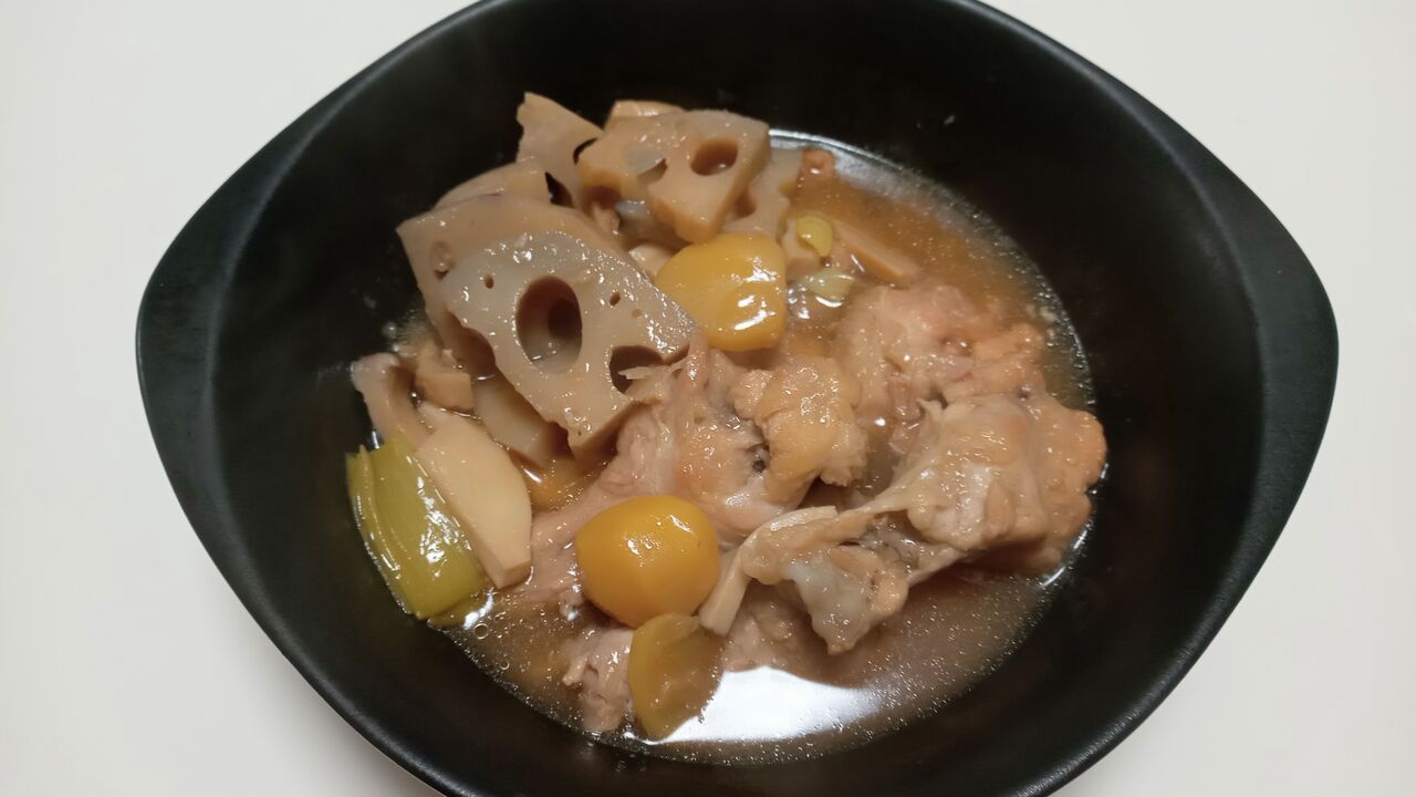 その後、蓮根などを加えて煮るときに栗の甘露煮とそのシロップとかき醤油を足しました