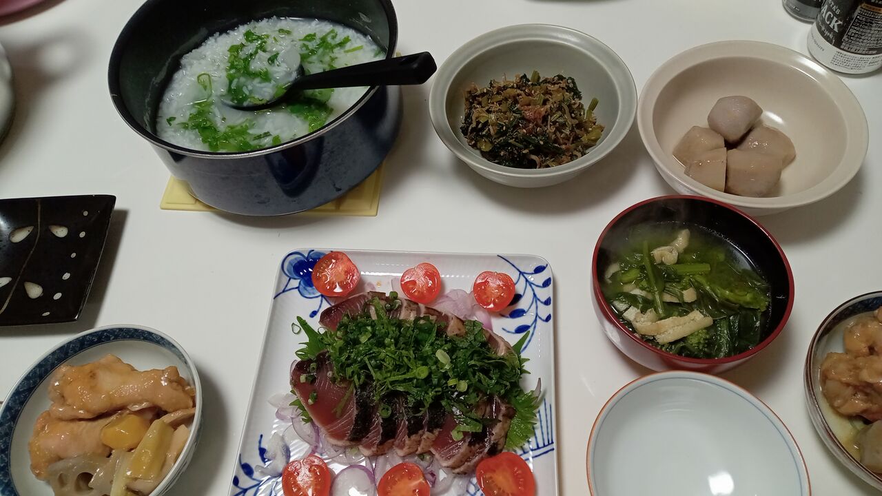 七草粥・かぶのふりかけ・里芋の煮物・鶏手羽元と蓮根とキノコの治部煮風