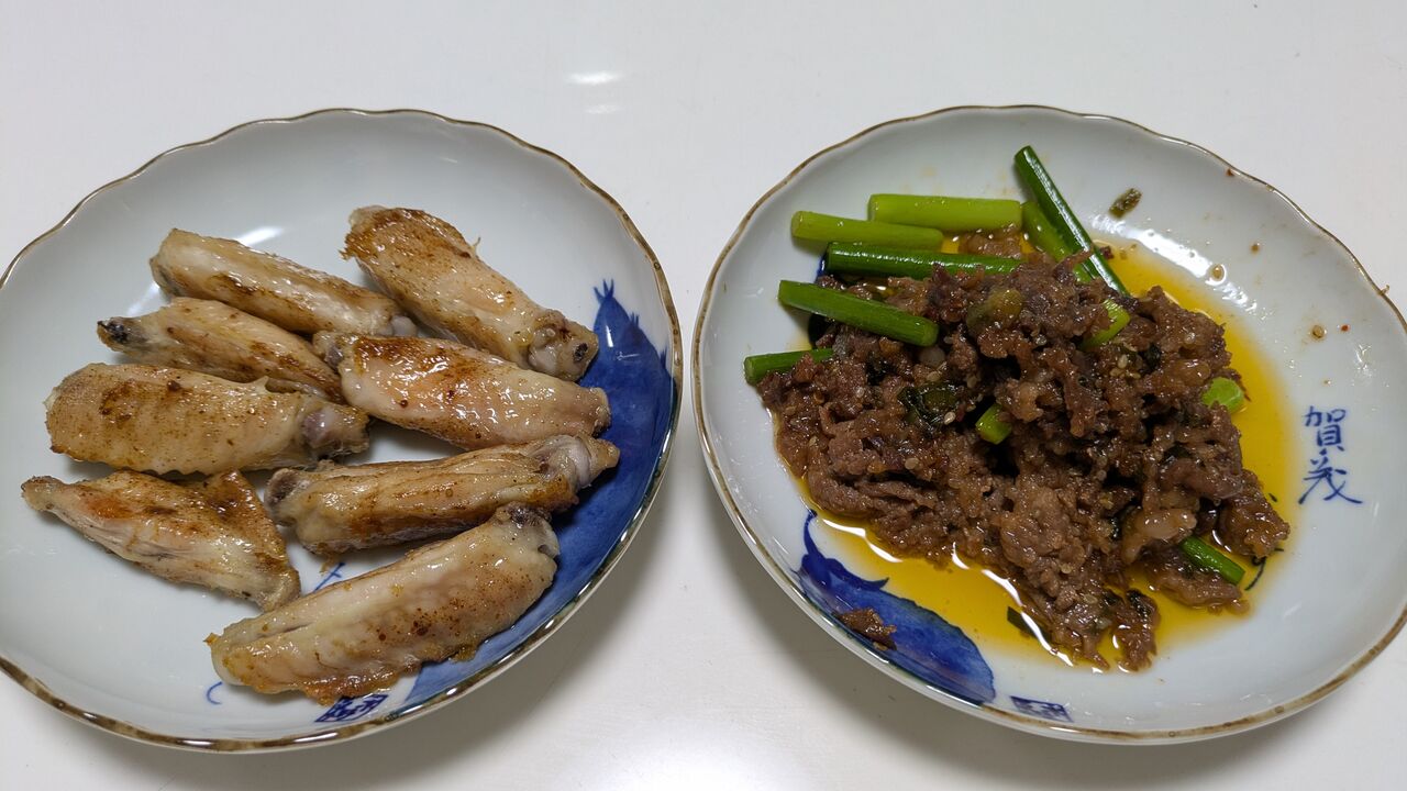 塩コショウしてトースターで焼いたチキンスティックと脂ギッシュなプルコギ