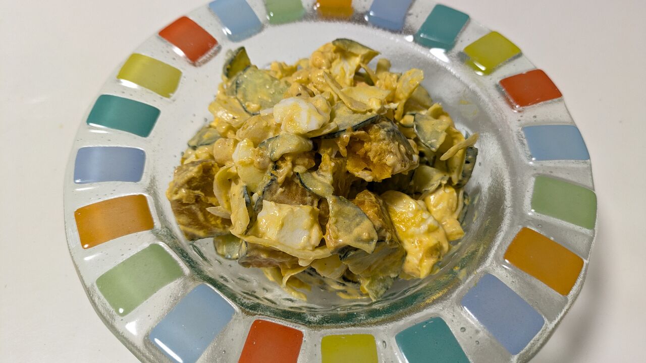 パンプキンサラダはマヨネーズに無糖ヨーグルトを足すと夏向けのさっぱりした味になりました