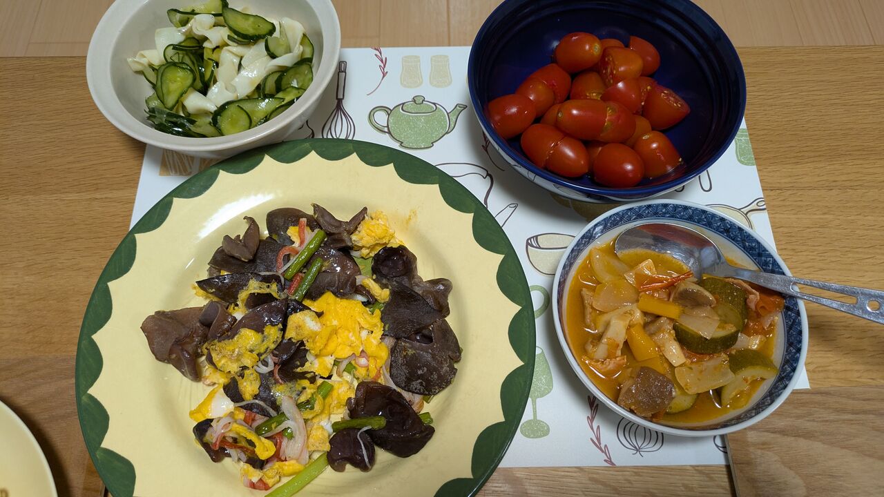 作ったのはきくらげ・カニカマ・卵の中華炒めだけ~の夕食