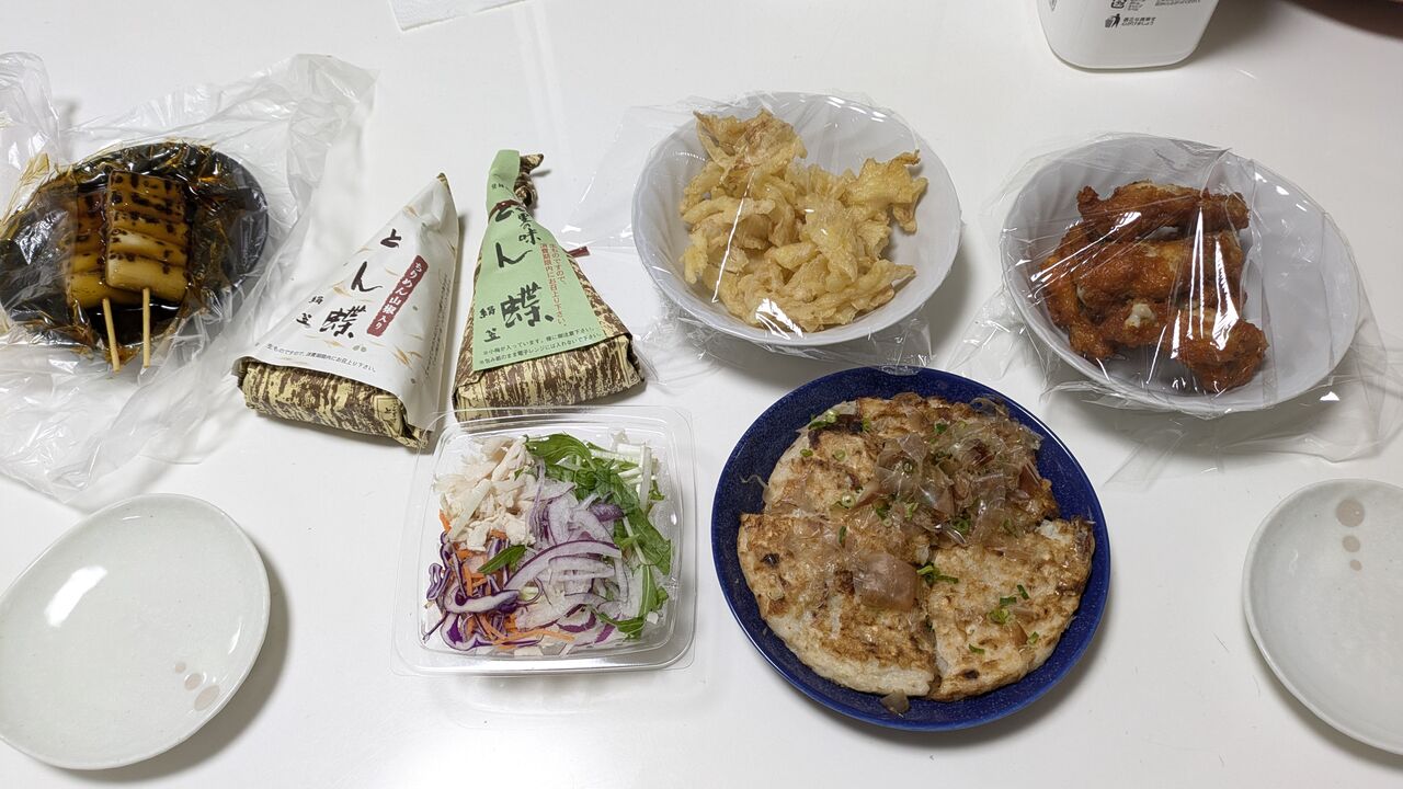 生姜天、鶏の唐揚げ、山芋焼き、サラダ、喜八洲総本舗のみたらし団子など