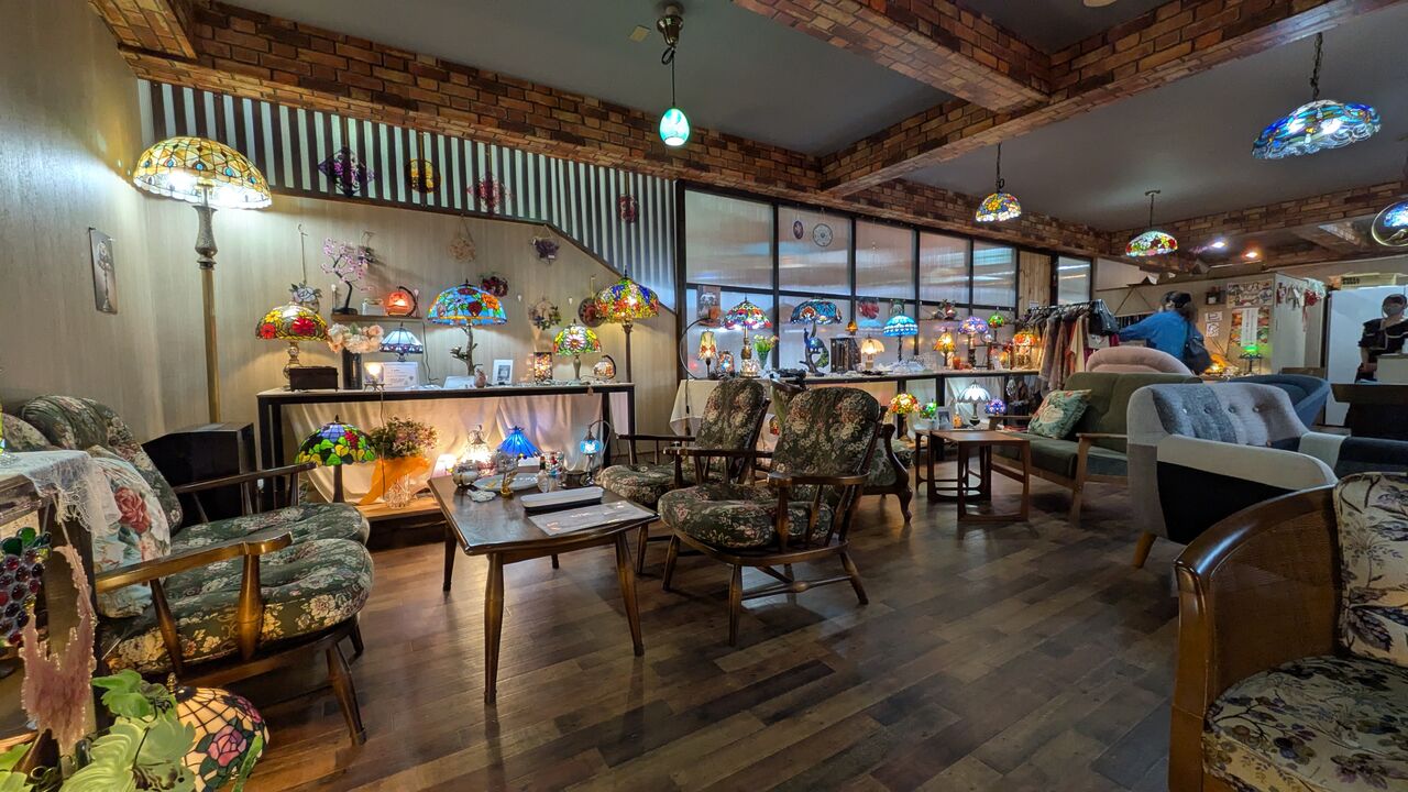 奥さま(店主さん?)が長年収集されてきたステンドグラスやアクセサリーは