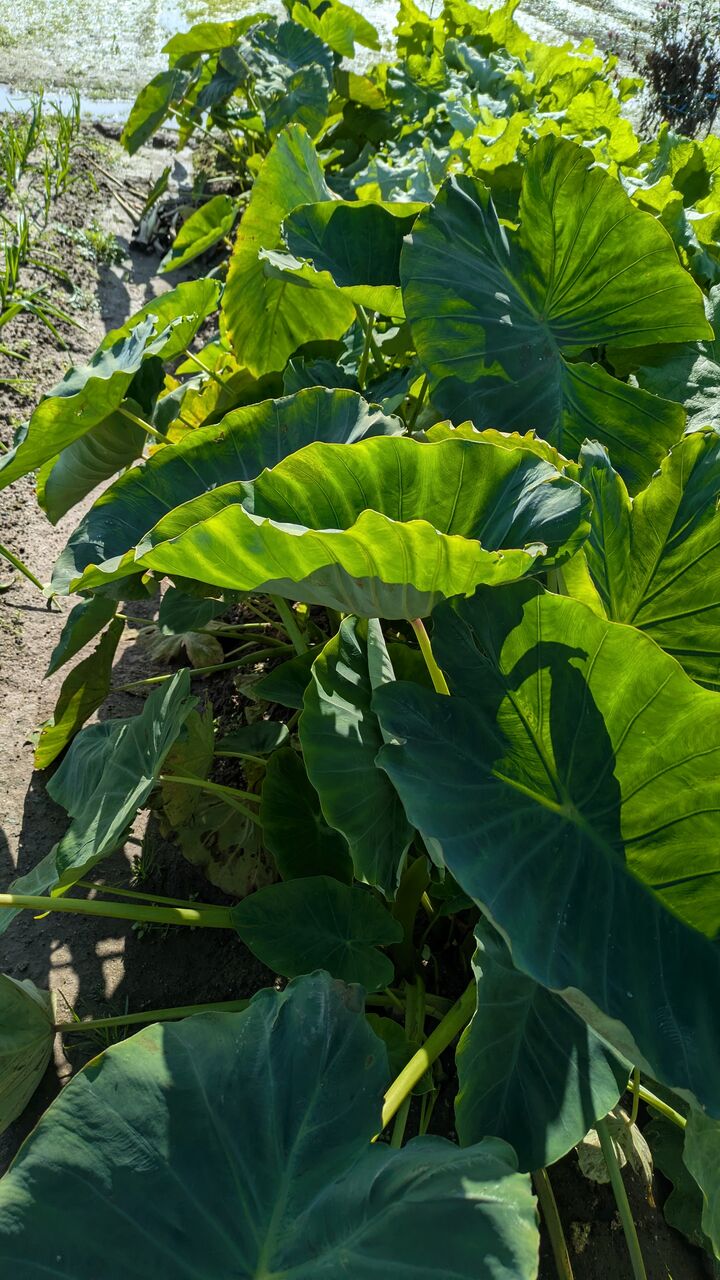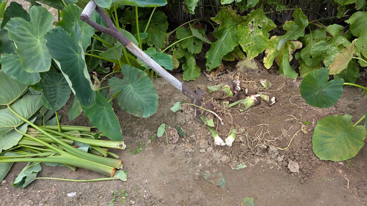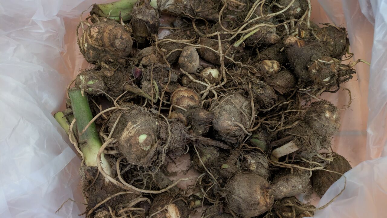 里芋同士が絡み合っていて長い根っこがついているところとか