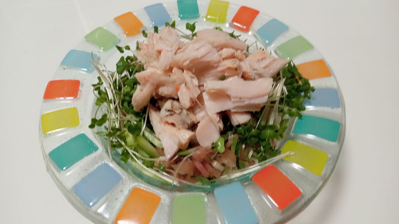 胡瓜・ブロッコリースプラウト・みょうがの上に裂いたサラダチキンをのせて