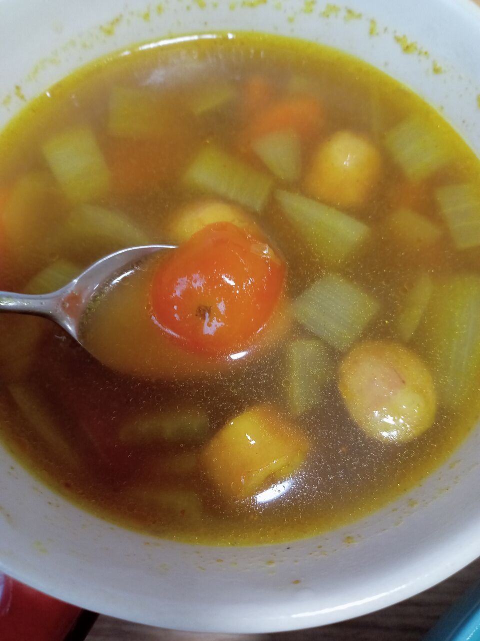 大豆と残り野菜とソーセージ、ドライトマトのカレースープ