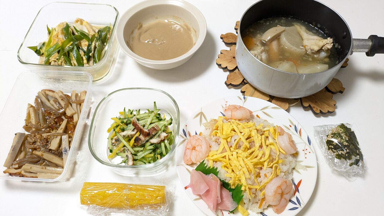 焼き穴子の和え物・ちらし寿司・たくあん