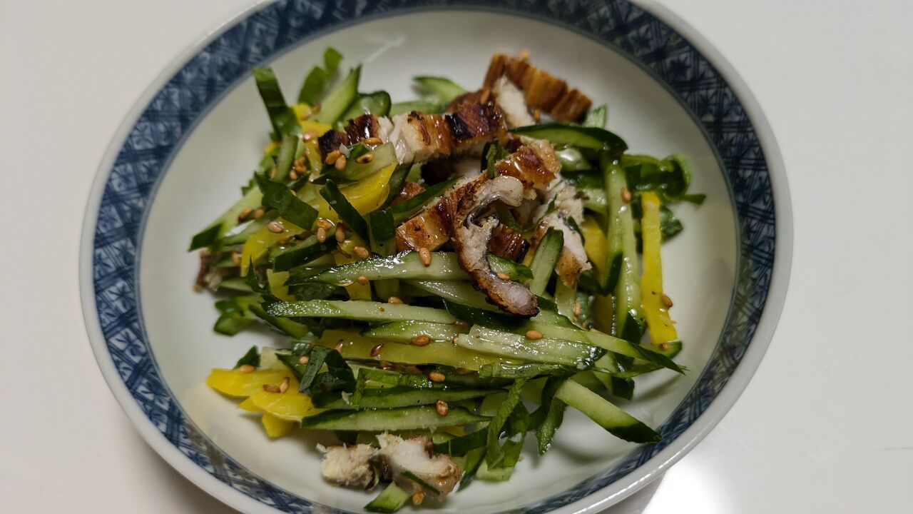 焼き穴子・胡瓜・大葉・たくあん・胡麻を混ぜてえごま油をかけただけですが