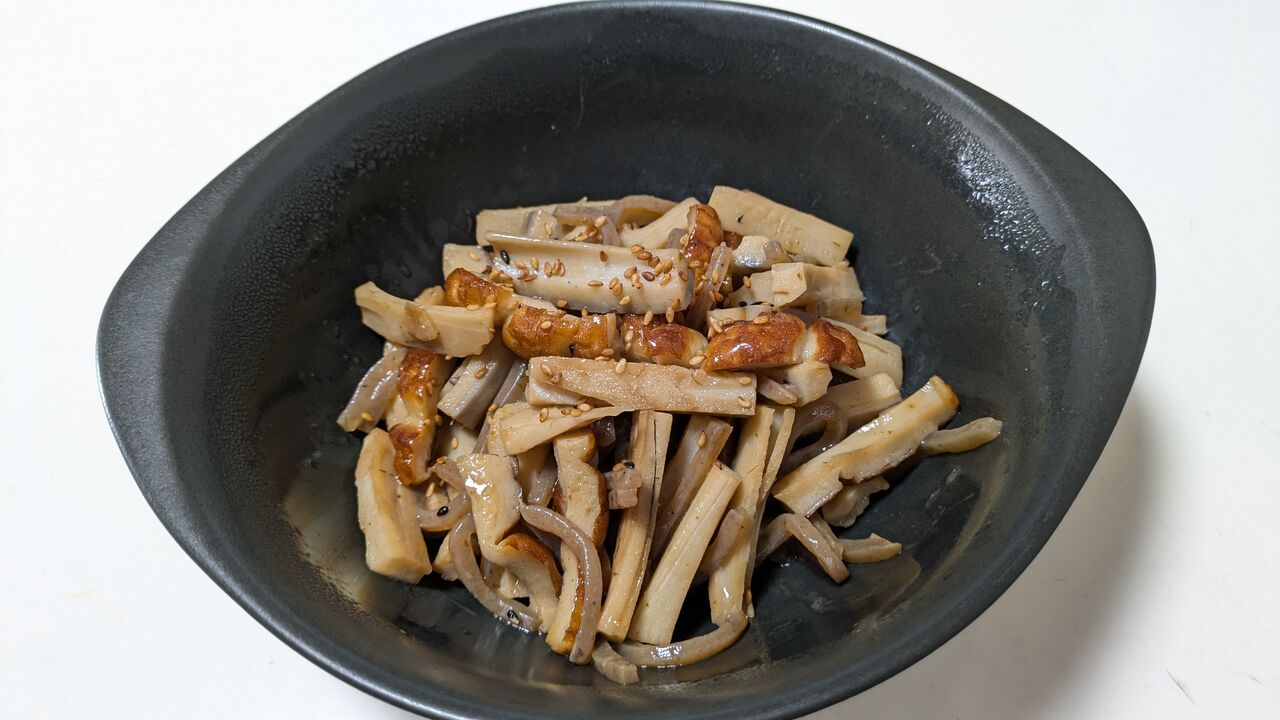 蓮根のきんぴらですが、縦切りにした蓮根はシャキシャキしていて美味しいです