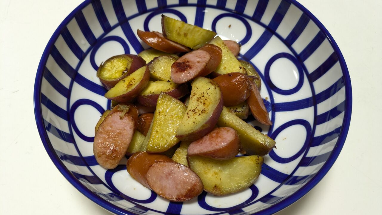 義父のさつまいもとフランクフルトをバターと塩コショウで炒めました