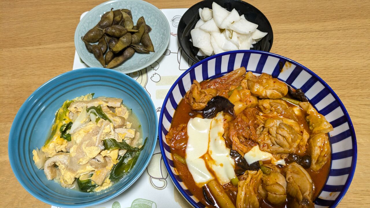 黒枝豆・蕪の浅漬け・京揚げと長ねぎの玉子とじ・チーズダッカルビ