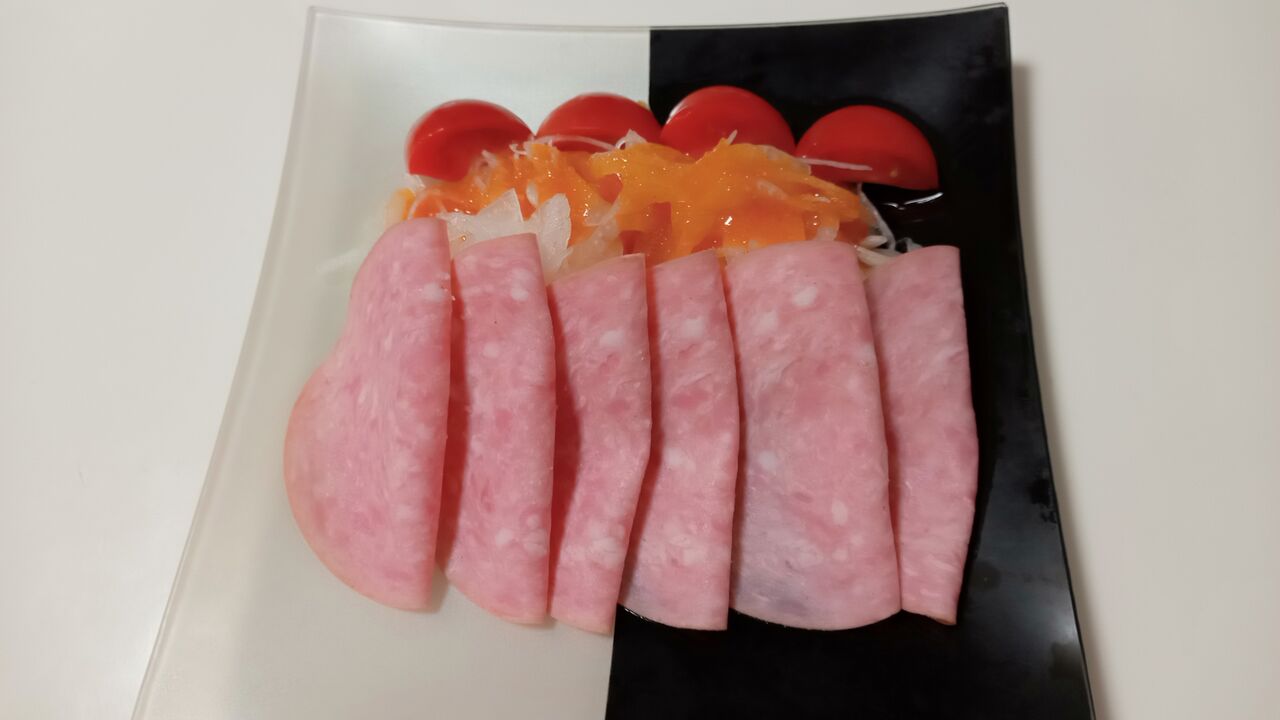 ビアソーセージと玉ねぎ・ミニトマトのサラダは三田屋のドレッシングで