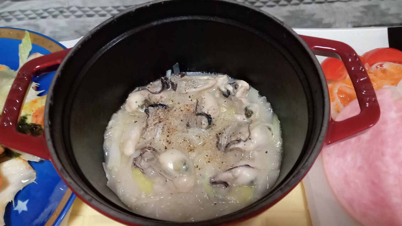 白ネギ・玉ねぎをバターで炒めて牡蠣と白ワインで蒸し煮にしましたが