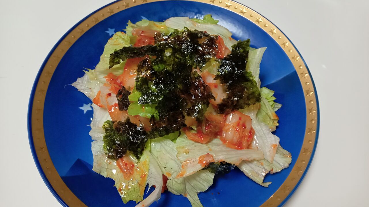 レタスとキムチのサラダはトッピングに韓国海苔と高級ごま油をかけました