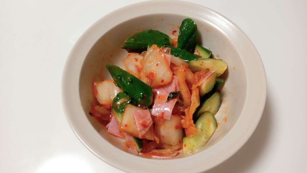 胡瓜とキムチとハムをごま油で和えただけ~
