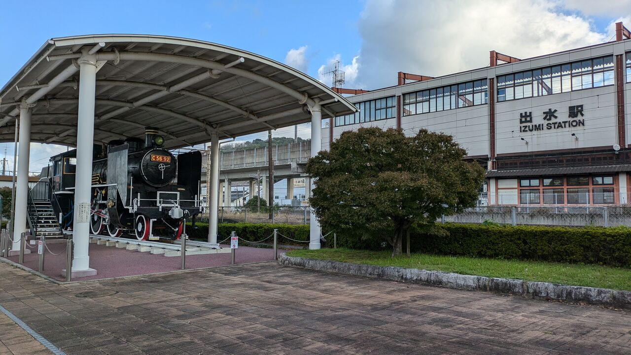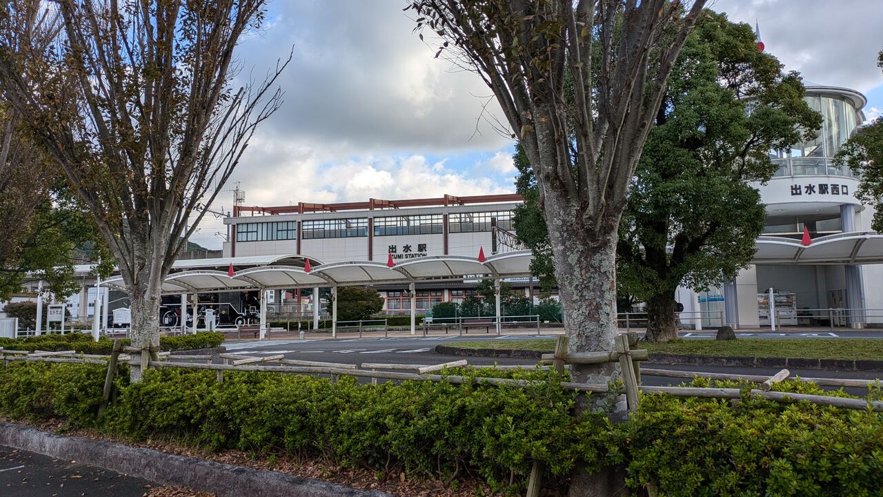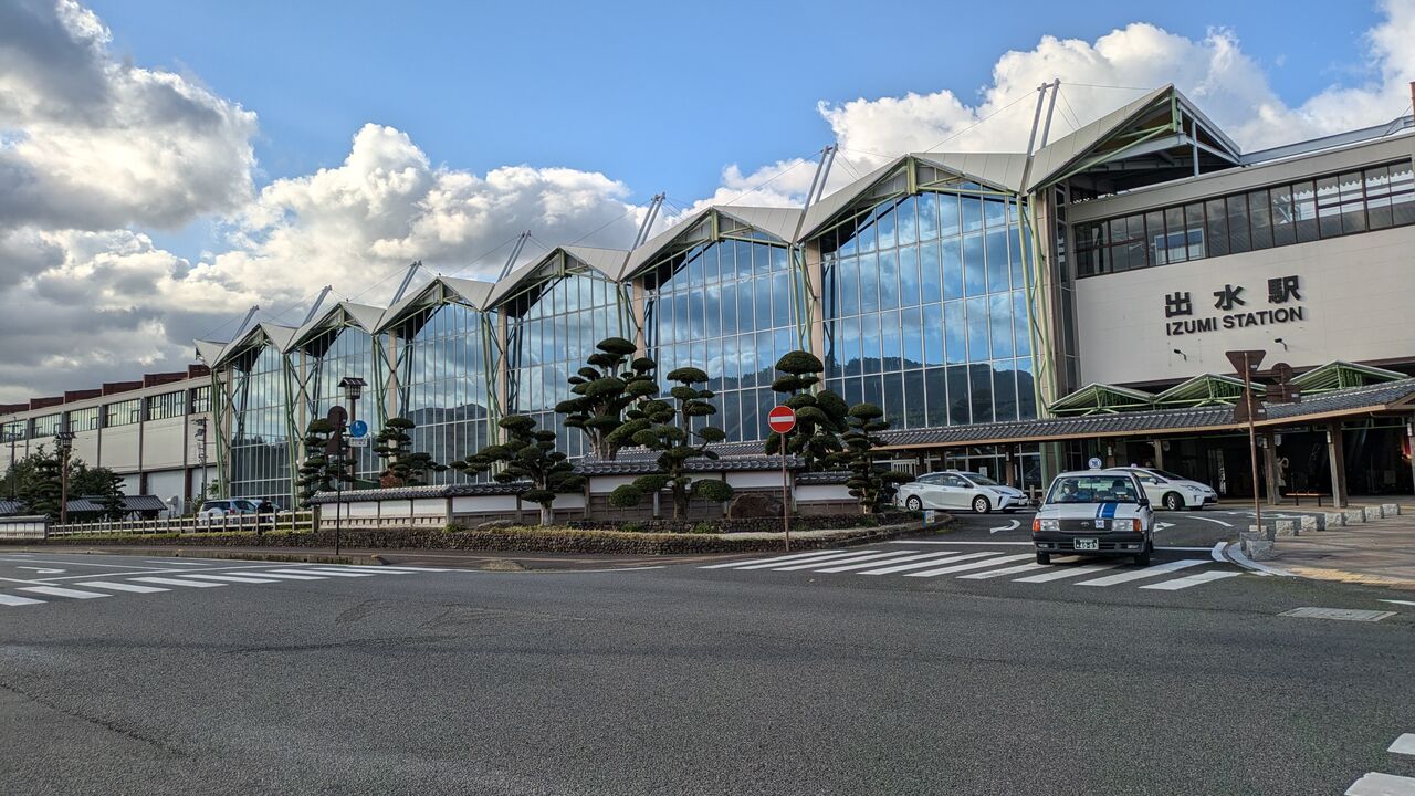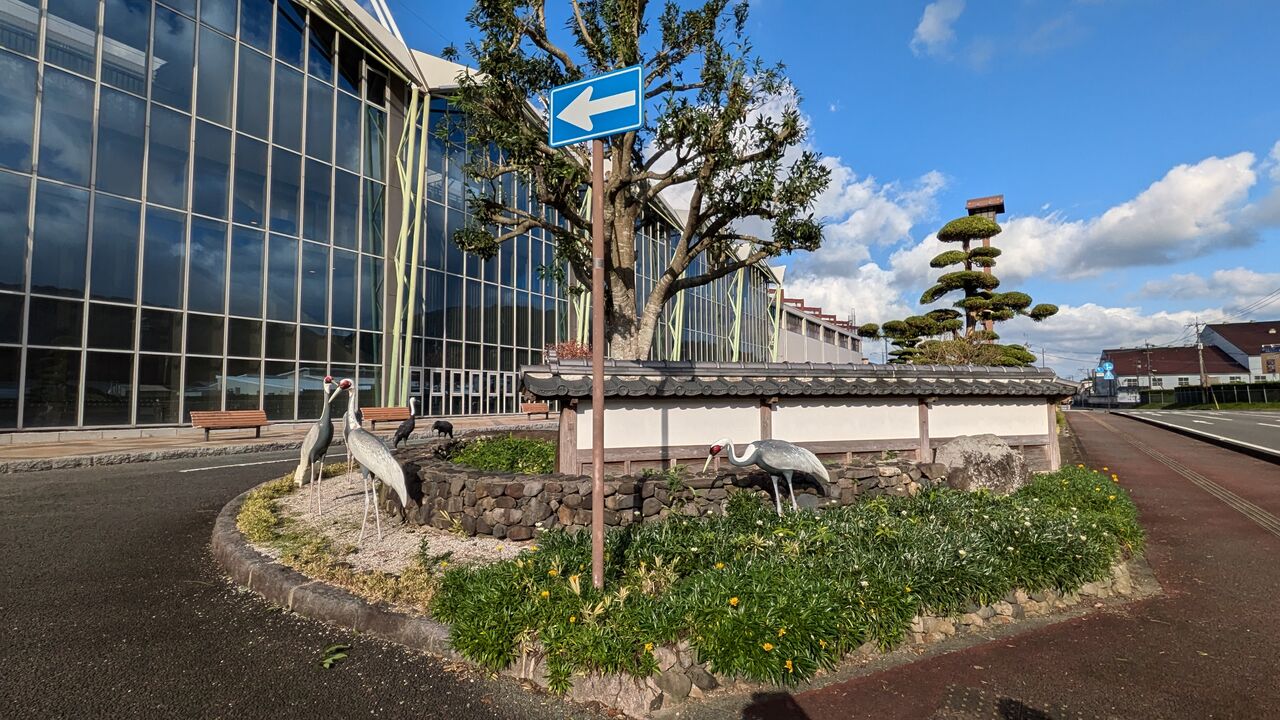 出水市は鶴の飛来地ということで、駅前に日本庭園と鶴のオブジェがあります