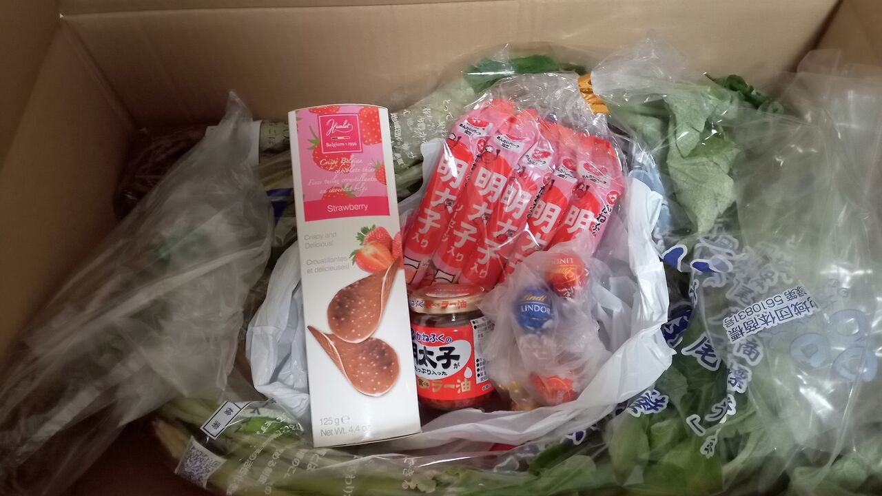 かねふく明太子パークのお土産と私が食べたがっていたコストコのチョコが入っていました