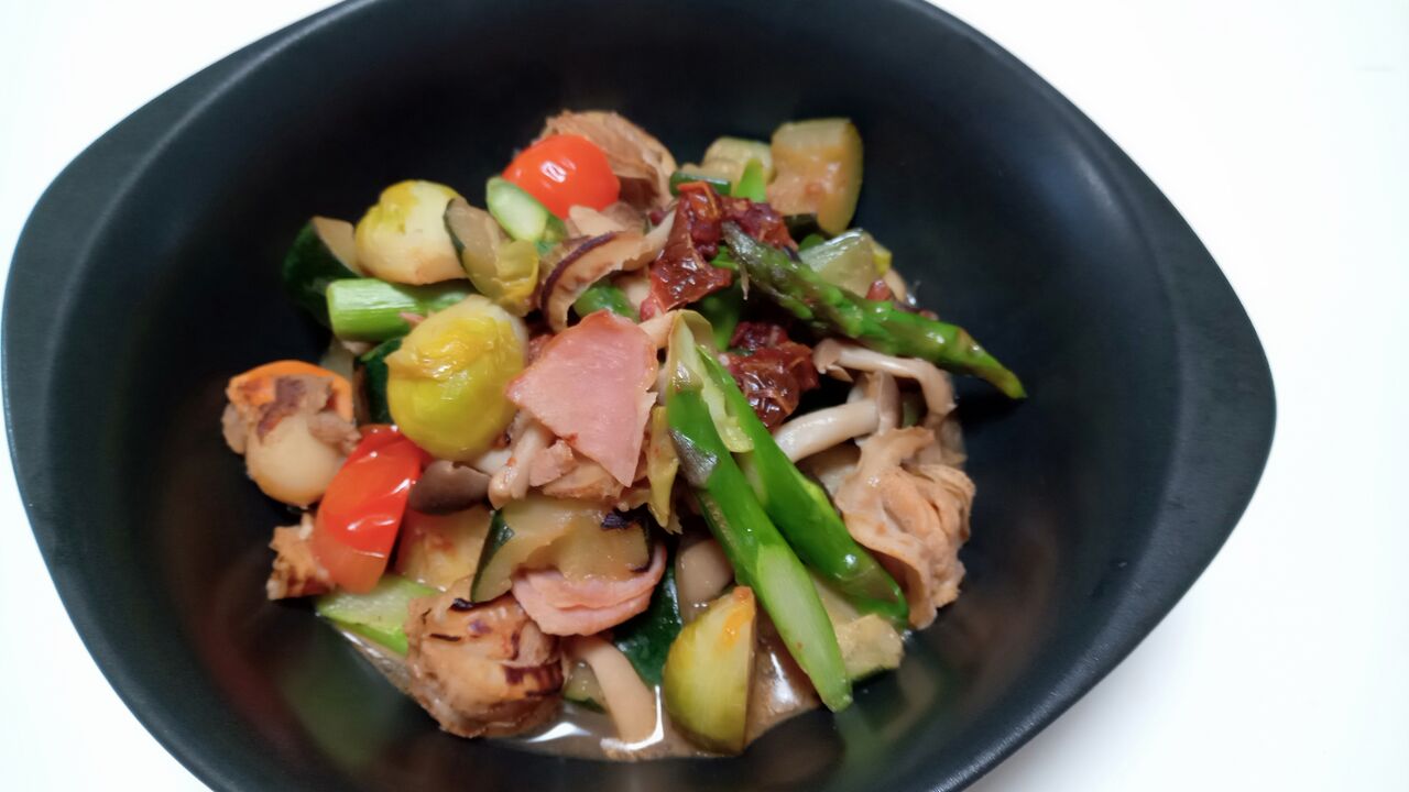 芽キャベツや野菜・ベビーホタテとベーコン・ドライトマト入りの白ワイン煮込みですが