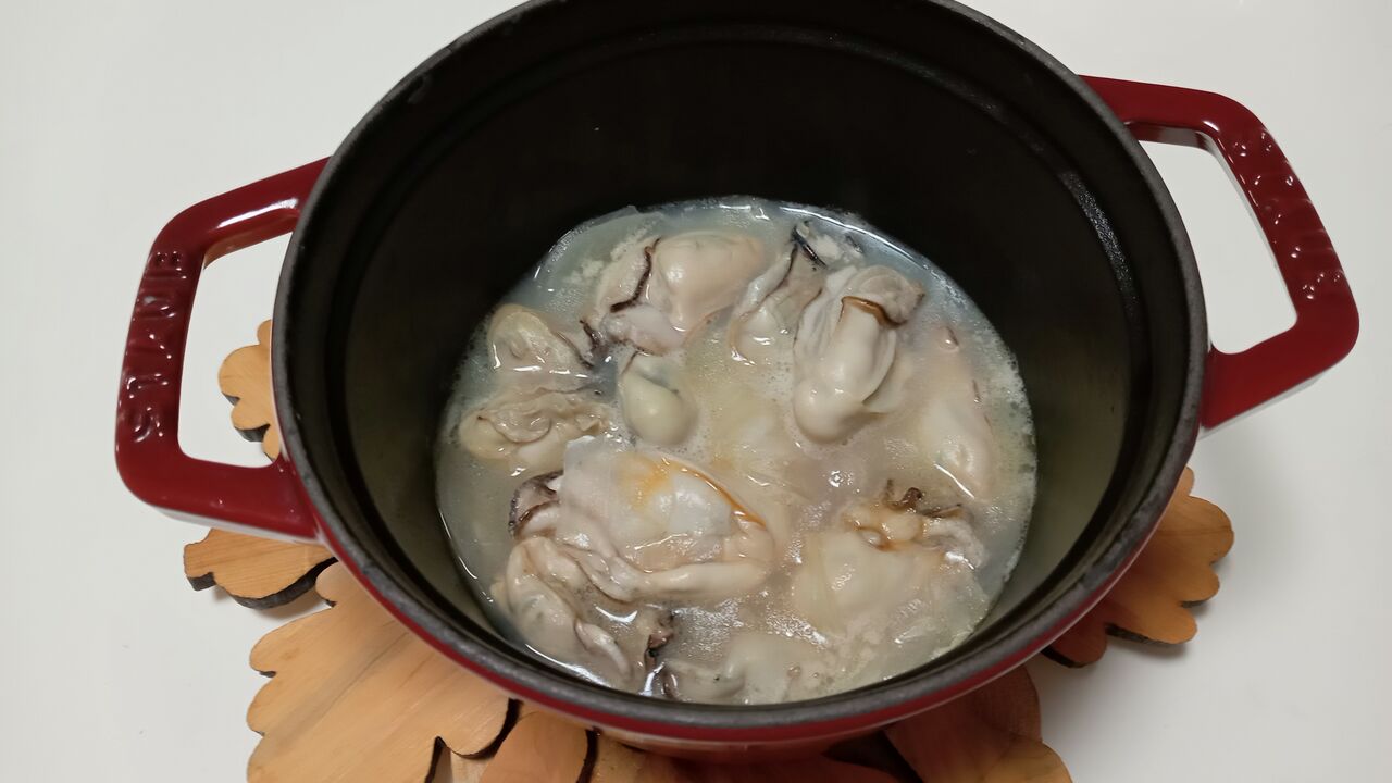 お鍋にスライスした玉ねぎとバターを入れて炒めて牡蠣・シャルドネを入れて蒸し煮に