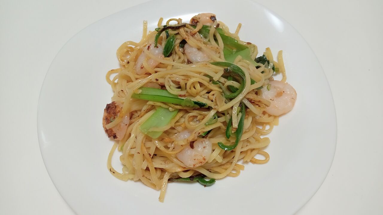 海老と小松菜を使って上海焼きそば byカルディ