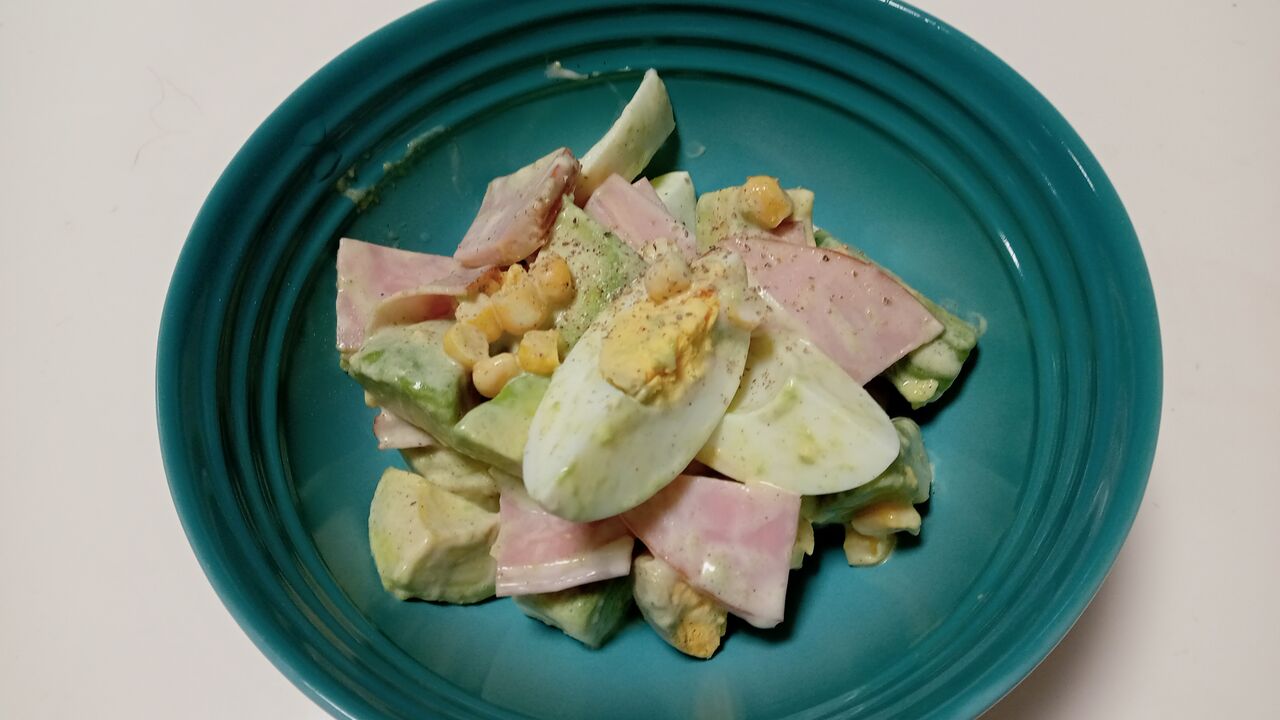 ゆで卵・ハム・コーン・アボカドのデパ地下風サラダですが、アボカドの熟し具合が